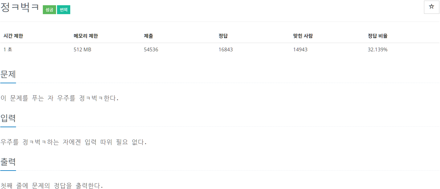 우주를 정ㅋ벅ㅋ할 사람에게는 예제 입력과 예제 출력이 필요하지 않다.