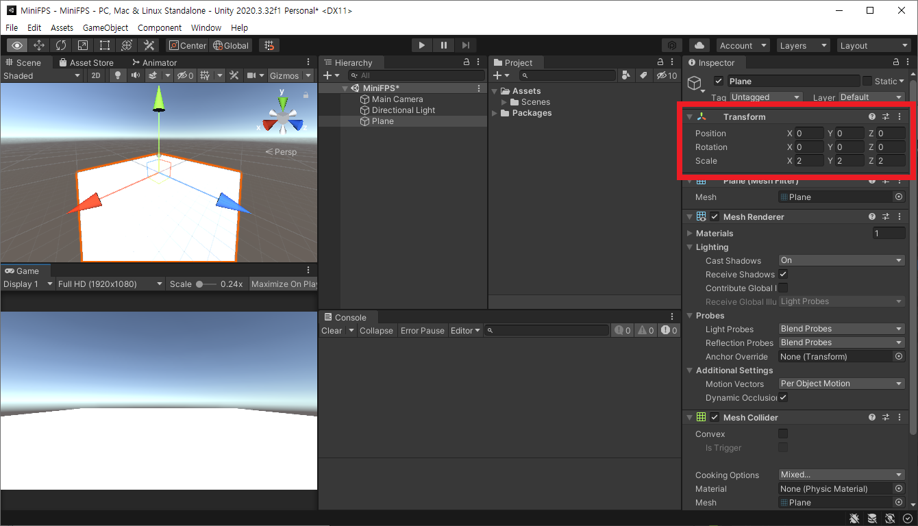 Plane의 Inspector → Transform의 속성값을 아래와 같이 지정한다.