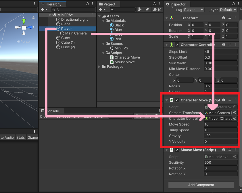 온통 하얀색 화면이면 플레이어가 정상적으로 이동하는지 직관적으로 확인하기가 어렵다. 따라서, 적절한 색상을 입혀 직관적으로 확인하기 위한 과정이니, Material 요소 생성 과정은 불필요할 경우 생략해도 좋다. 필자는 직관적으로 확인하기 위해 간단한 색상 Red, Green, Blue, Black 네 개를 추가했고, Material 요소를 통한 객체에 색상을 입히는 방법은 아래 링크를 참고하면 좋겠다.