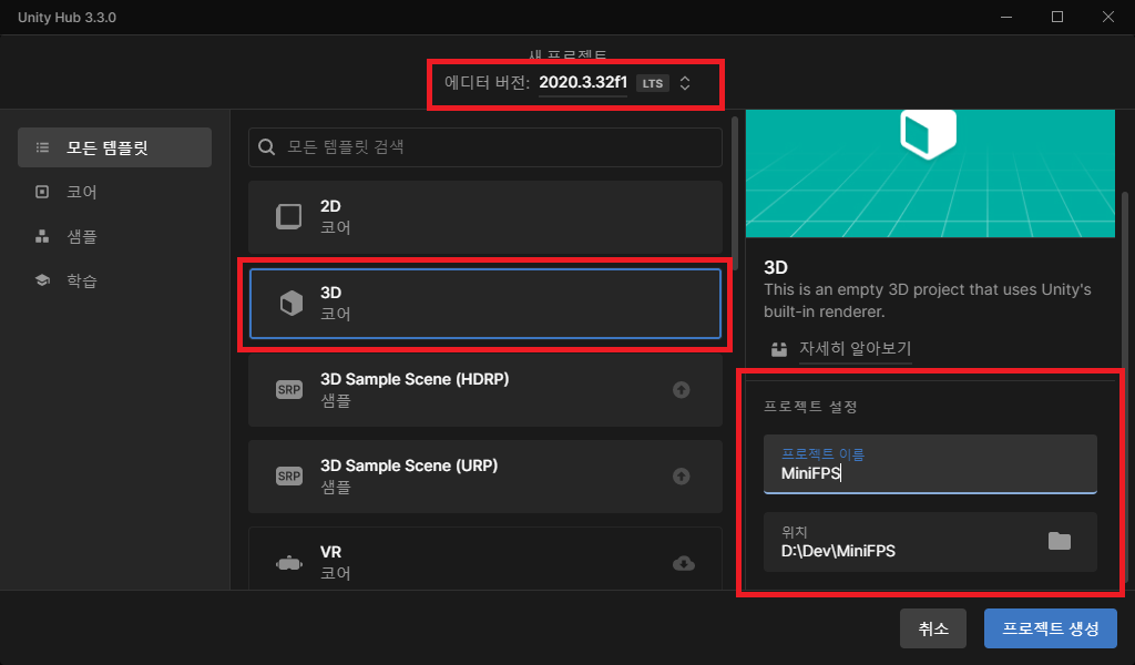 본문에서 사용한 에디터 버전은 2020.3.32f1 LTS 버전이고, 하단에 첨부할 프로젝트 첨부파일 또한 해당 버전이니 참고 바란다.