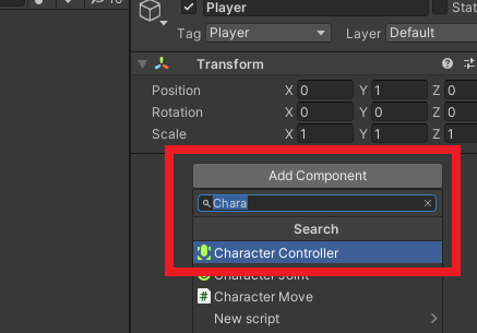 'Add Component' 버튼을 클릭하고, 'Character Controller' 컴포넌트를 추가한다.