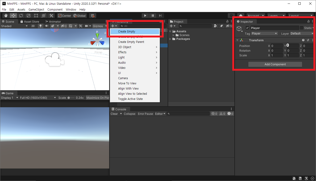 Hierarchy → + → Create Empty 객체를 하나 생성하고, Inspector 속성값과 Transform 속성값을 아래와 같이 지정한다.