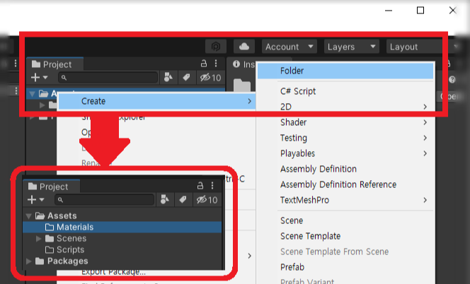 Project의 Assets폴더 하위로 Create → Folder을 클릭해 'Materials' 폴더와 'Scripts' 폴더를 생성한다.