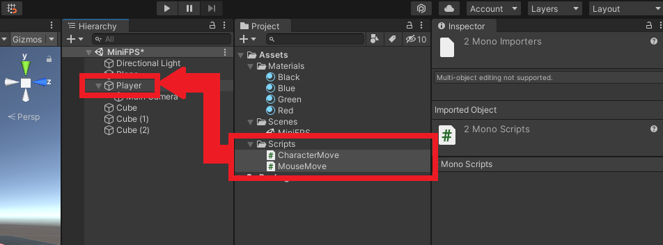 작성 완료된 C# 스크립트 두 개를 Player 객체에 드래그 앤 드롭해서 적용 시킨다.