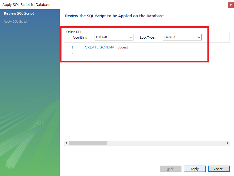스키마의 이름은 간단하게 DBTest로 지정하고, Apply 버튼을 클릭해 스키마를 생성한다.