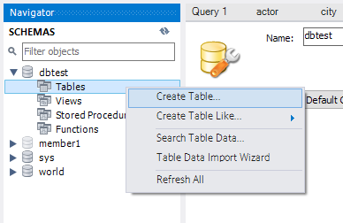 새로 생성한 dbtest 스키마를 더블 클릭하고, 마우스 우측 클릭을 해 Create Table 버튼을 누른다.