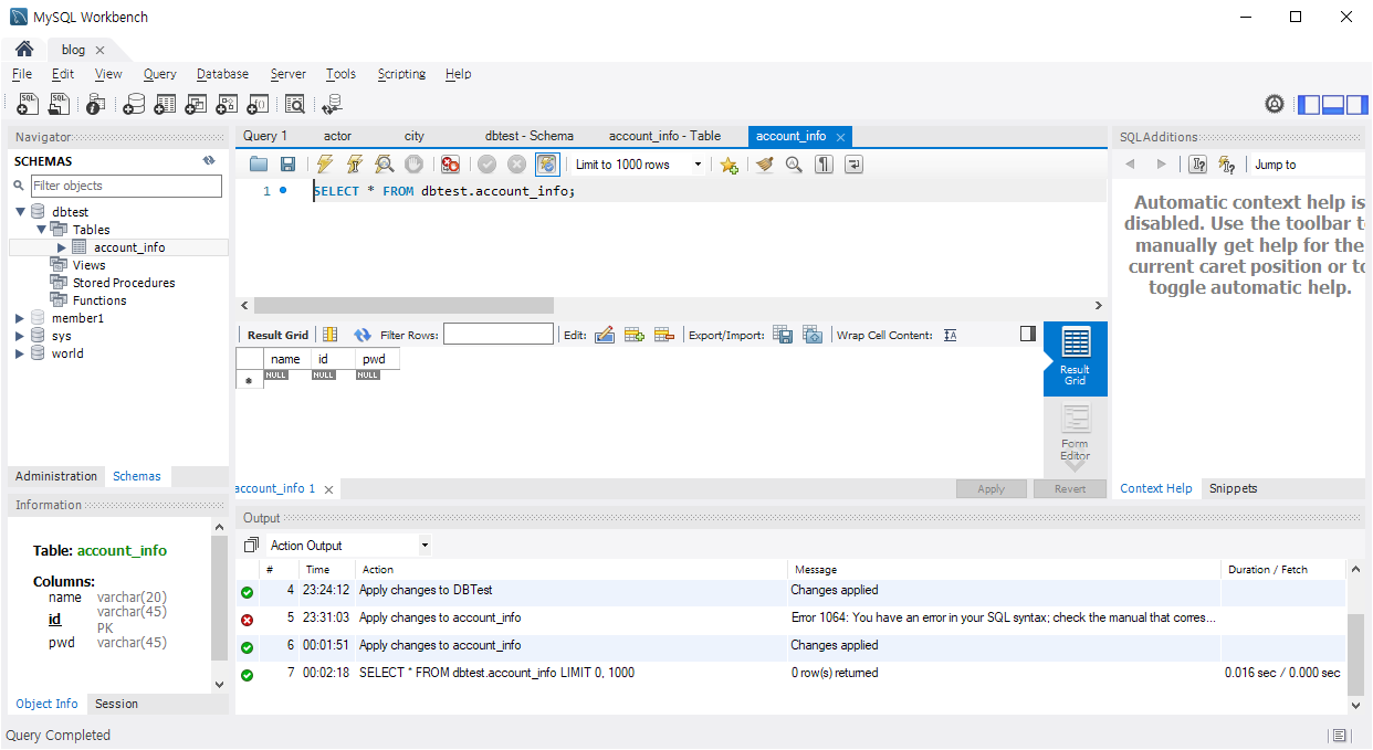 칼럼 이름 (Column Name) 을 지어주어야 하는데, 간단하게 '이름' 정보를 보관할 name 칼럼과 'id' 정보를 보관할 id 칼럼, '비밀번호' 정보를 보관할 pwd 칼럼을 생성했다.