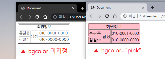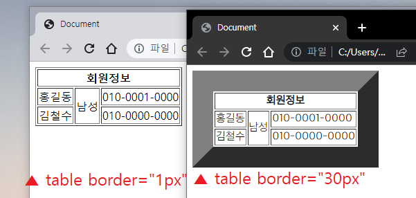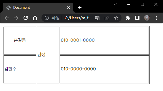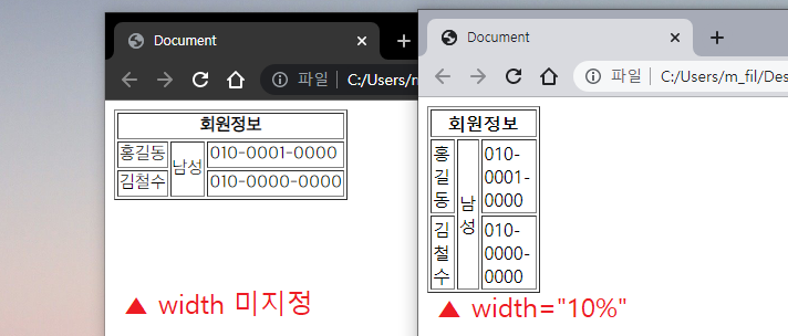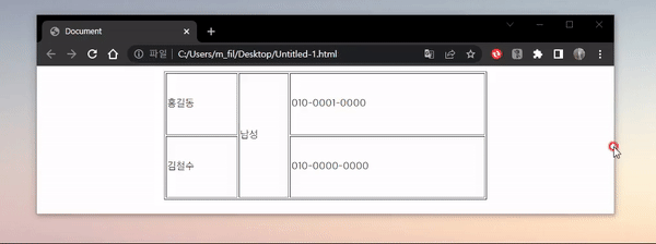 ▲ table에 align="center" 속성 사용▲ '홍길동' 셀에만 text align="center" 속성 사용