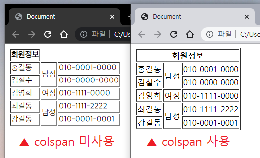 colspan | n개의 열을 하나의 열로 병합한다. |