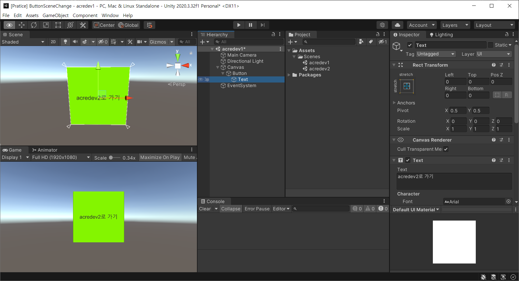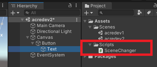 ※ acredev1.scene의 Button은 acredev2.scene으로 전환되는 버튼이다.