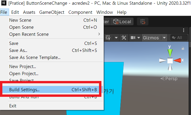 상단 메뉴의 File → Build Settings... 를 클릭한다. 또는, 단축키 Ctrl + Shift + B를 이용해 Build Settings 화면에 접근한다.