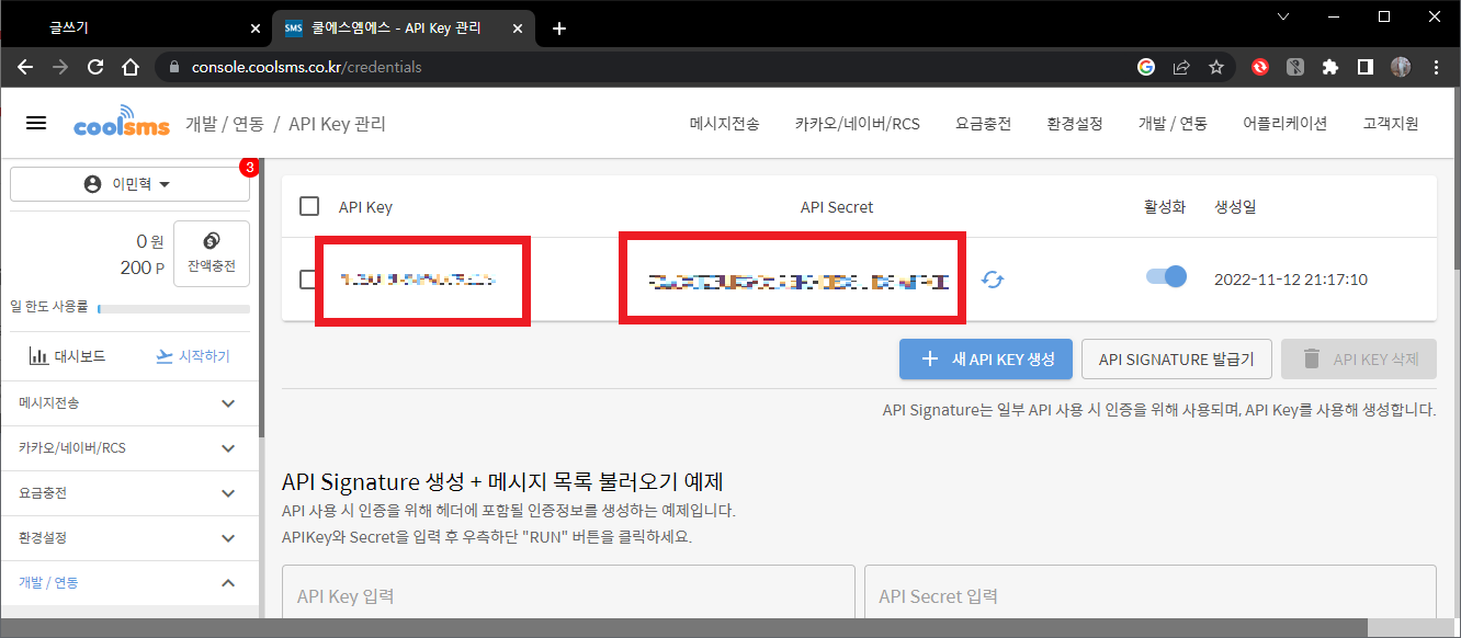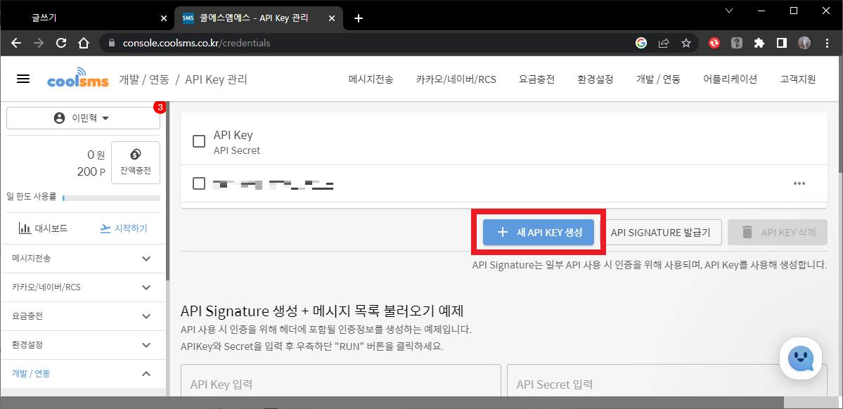 필자는 이미 API Key를 발급해 둔 상태라, 초기 세팅을 하는 사용자들과는 다른 화면이 출력될 것이다. API Key가 없는 사용자들은 + 새 API KEY 생성 버튼을 눌러, 간단한 본인인증 절차를 거친 후 SMS 발송을 위한 API Key를 발급받도록 한다.
