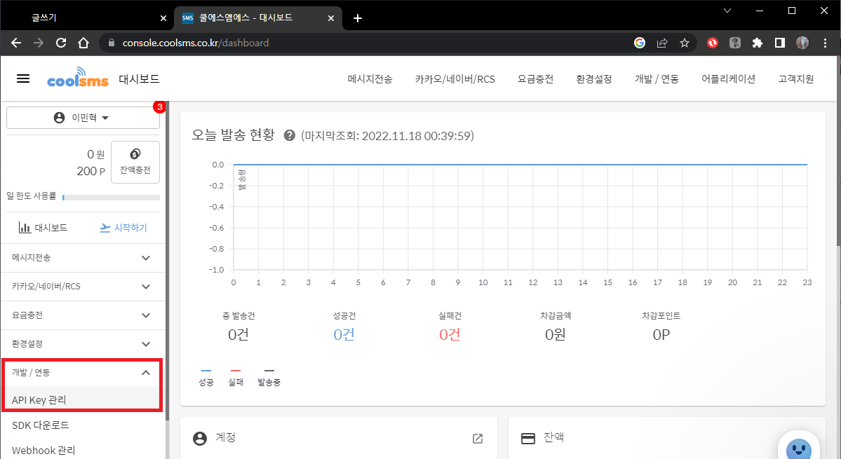 회원가입 완료 후, 로그인을 하게 되면 CoolSMS 대시보드 화면이 출력된다. 좌측 트리 메뉴의 개발 / 연동 → API Key 관리 버튼을 클릭한다.