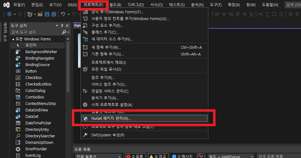 Visual Studio 상단 메뉴의 프로젝트 → NuGet 패키지 관리 버튼을 클릭한다.