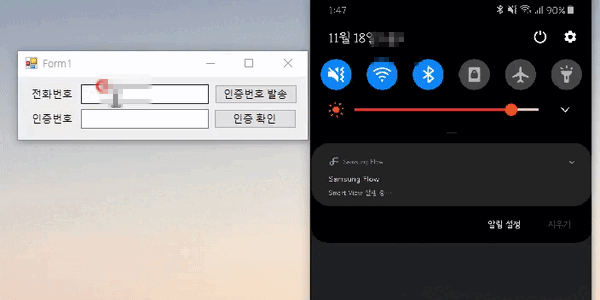 정상적으로 문자 발송이 이루어지고, 인증번호를 입력했을 때 일치 / 불일치 여부를 잘 판단하는 모습을 확인할 수 있다. 해당 코드를 잘 응용한다면 SMS 발송 시스템 또한 WinForm 을 이용해 만들 수 있을 것이다.