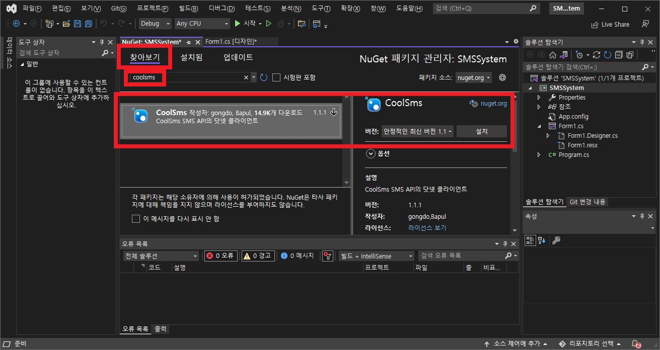 찾아보기 → coolsms를 검색하고, NuGet 패키지를 설치한다.