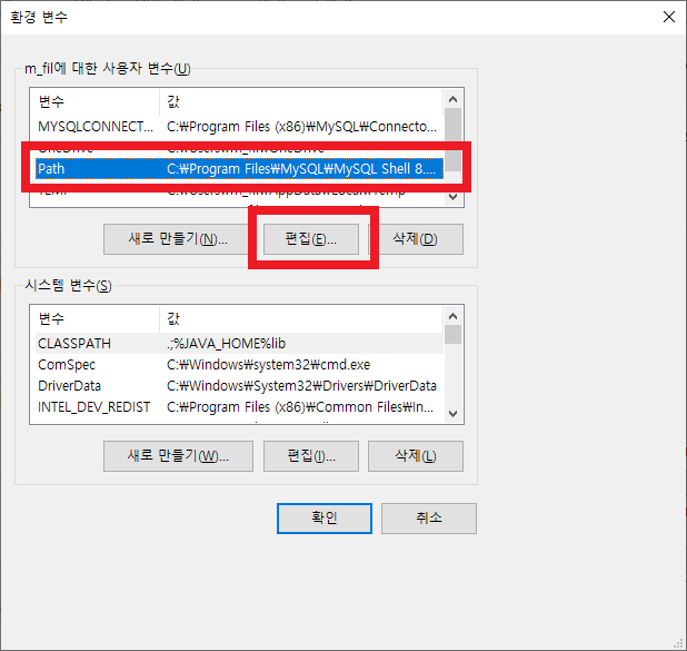 새로 만들기(N) 버튼 클릭 → 아까 확인했던 mysql.exe가 존재하는 폴더 경로를 입력하고 확인 버튼을 눌러 저장한다.