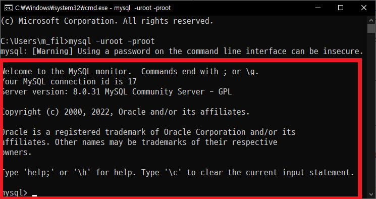 CMD 창이 표시되면, 위와 같이 MySQL 접속 명령어를 입력 해 보자. 이제 윈도우 CMD에서도 정상적으로 MySQL 서버에 접속이 가능한 모습을 확인할 수 있다.