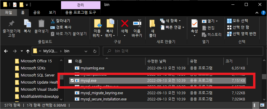 보통 위와 같은 경로에 mysql.exe 파일이 존재한다. 해당 경로가 없다면, 아래의 링크를 참고해 조치하도록 하자.