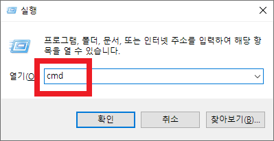 키보드의 윈도우 + R 버튼을 눌러 윈도우 실행창을 띄운다. 위와 같은 검색어를 입력하고, 확인 버튼을 눌러 CMD 화면에 진입한다.