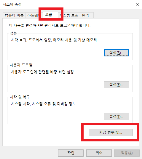 고급 탭으로 진입 → 환경 변수(N)... 버튼을 클릭한다.