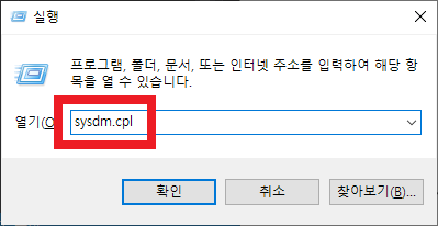 키보드의 윈도우 + R 버튼을 눌러 윈도우 실행창을 띄운다. 위와 같은 검색어를 입력하고, 확인 버튼을 눌러 시스템 속성 화면에 진입한다.