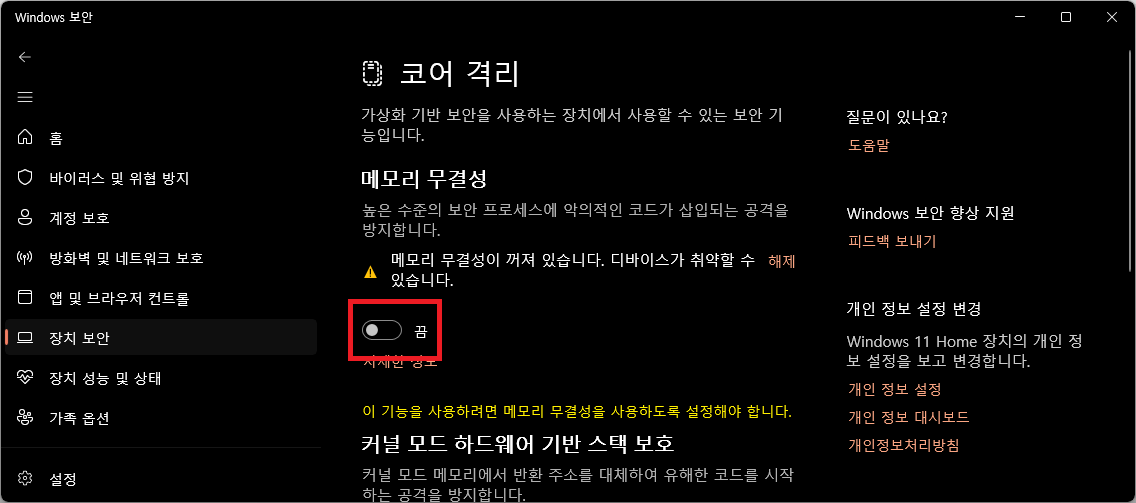 Windows 작업 표시줄 검색창에 Windows 보안을 입력 후, 실행한다.