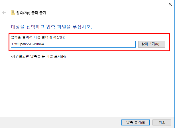 경로는 크게 상관없으나 원활한 사용을 위해서는 해당 경로에 위치시키는 것을 권장한다. 본 포스트에서 OpenSSH 설치 구성 파일들을 위치시킨 경로는 C:\OpenSSH-Win64 이다.