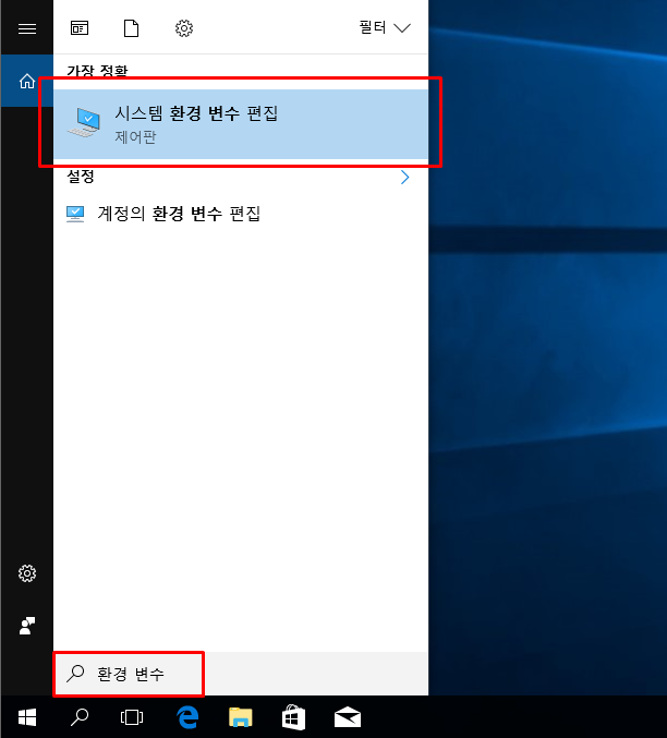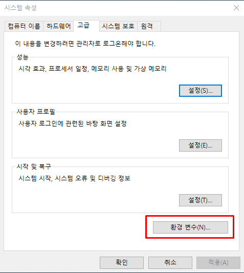 Windows 검색기능을 이용하여 환경 변수 검색 후, 시스템 환경 변수 편집 항목에 진입한다.