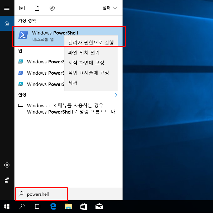 Windows PowerShell을 관리자 권한으로 실행한다.