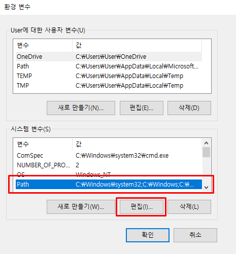 시스템 변수 항목에 있는 Path 변수를 편집해야 한다. 아래의 항목이 없으면 추가해 주도록 하자.