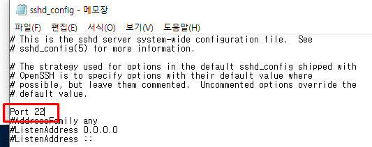 Port 항목의 주석처리를 해제하고, 사용할 포트번호를 변경한다. 대체적으로 22번 포트를 많이 사용하기 때문에 본 포스트에서도 그대로 유지하고 진행하도록 하겠다.