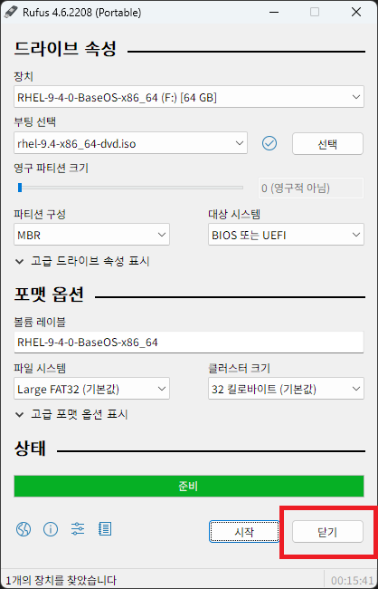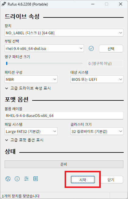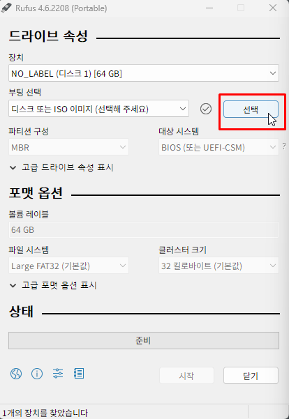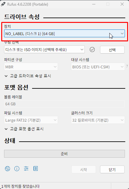 다운로드 받았던 rufus portable 프로그램을 실행하고, 장치 항목에서 부팅 디스크를 제작할 USB를 선택한다.