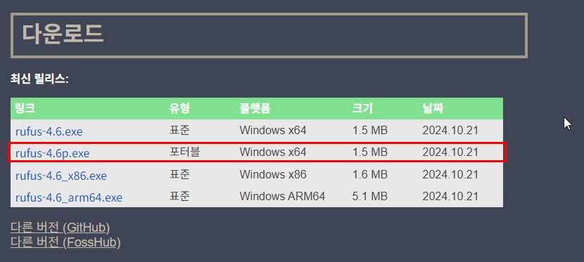 스크롤을 하단으로 내려, rufus 포터블 버전을 다운로드 받는다.