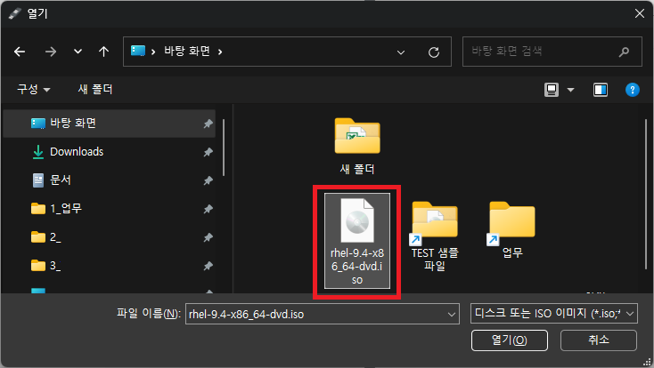 다운로드 받았던 RHEL dvd iso 이미지 파일을 선택한다.