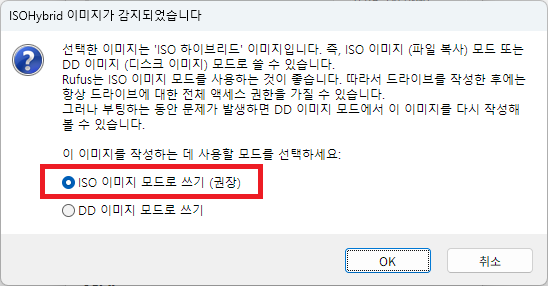 ISO 이미지 모드로 쓰기 (권장) 선택 후, OK 버튼을 클릭한다.