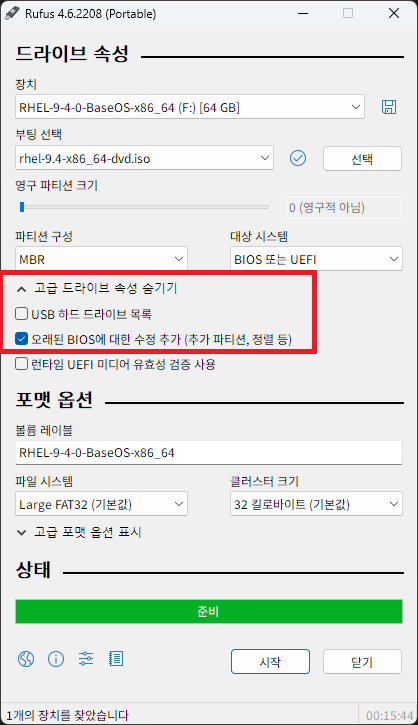 RHEL DVD 디스크 이미지 파일을 불러오면 옵션이 기본적으로 셋팅되는데, 고급 드라이브 속성 표시 버튼을 눌러 꼭 오래된 BIOS에 대한 수정 추가 (추가 파티션, 정렬 등) 항목에 체크를 한다.