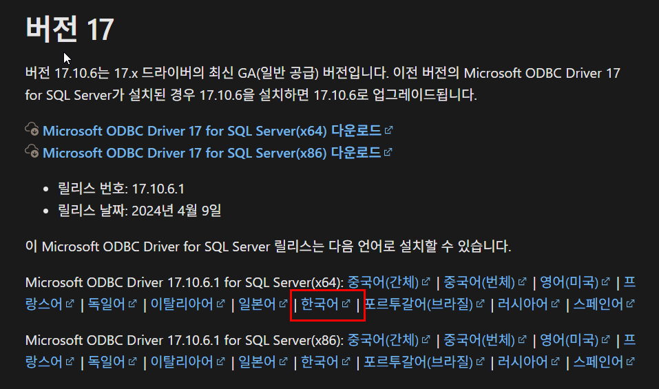 MSSQL의 ODBC 드라이버를 설치하기 위해, 상기 링크 (MS 공식 문서) 에 접속한다.