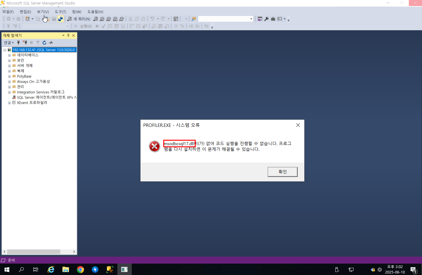 | msodbcsql17.dll이(가) 없어 코드 실행을 진행할 수 없습니다. 프로그램을 다시 설치하면 이 문제가 해결될 수 있습니다. |