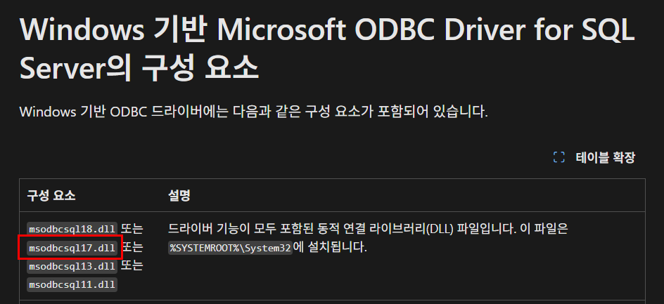 필자의 경우 msodbcsql17.dll 이 없어서 발생하는 오류였기 때문에 ODBC 드라이버 버전 17을 내려받았다.