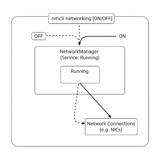 nmcli networking[ON/OFF] 는 시스템의 전체 네트워크 기능을 ON/OFF 하는 전원 차단기와 같은 역할을 한다.NetworkManager는 네트워크 연결을 관리하는 서비스 데몬이다.Network Connections는 실제로 네트워크에 연결되는 통로인 하드웨어 네트워크 인터페이스 카드 등의 네트워크 연결 자체를 의미한다.