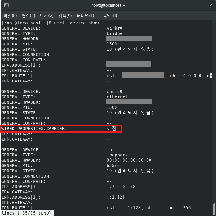 네트워크 장치의 세부 정보를 확인해 보자. WIRED-PROPERTIES.CARRIER : 꺼짐으로 출력되는 것을 확인할 수 있다.