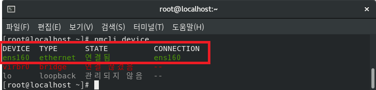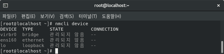 NetworkManger 가 관리하는 네트워크 장치에 대한 상태 정보를 확인해 보자. 필자는 ens160 이름의 네트워크 장치를 사용하고 있는데, STATE (상태) 가 관리되지 않음으로 출력되는 것을 확인할 수 있다.