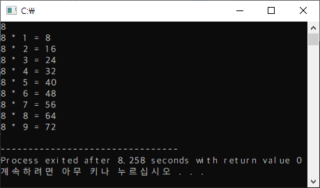 예시값 8을 입력하니 정상적으로 구구단 8단이 출력되는 모습을 확인할 수 있다.